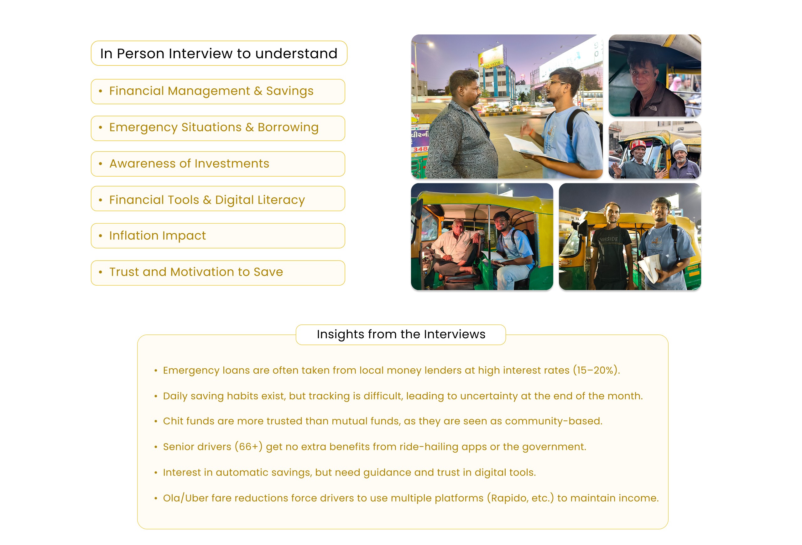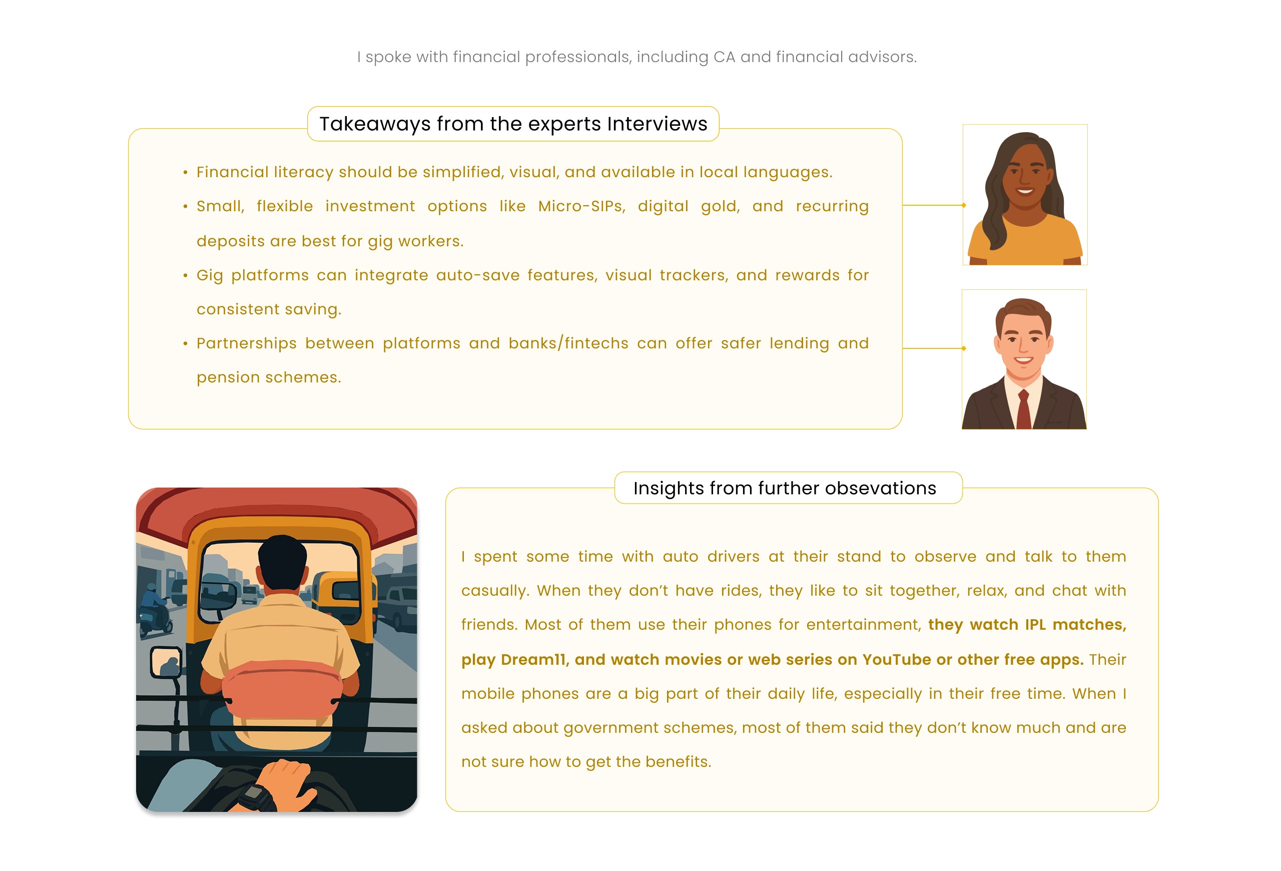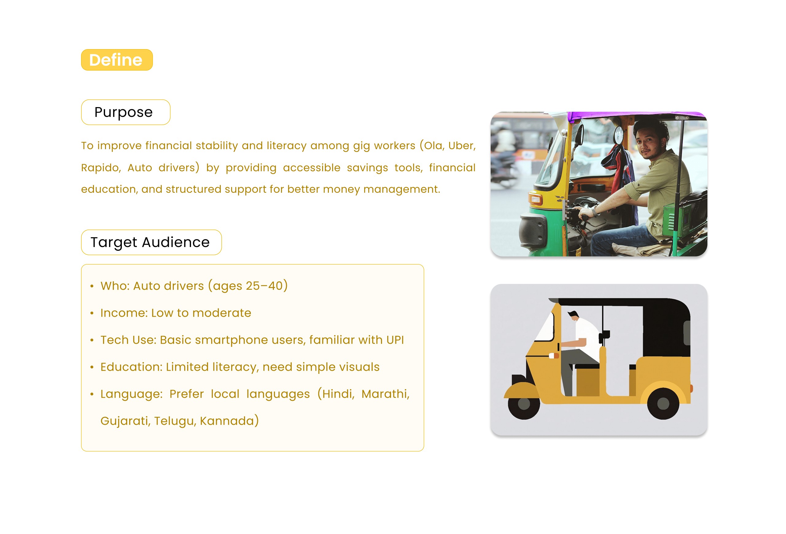 Promoting Financial Awareness and Savings Habits Among Gig Workers is a research-driven design project aimed at improving the financial wellbeing of daily wage earners, especially Rapido auto drivers. The study explores their income patterns, saving challenges, and limited access to financial tools, leading to a design solution that encourages consistent saving, provides easy financial guidance, and empowers drivers to manage their money with confidence.