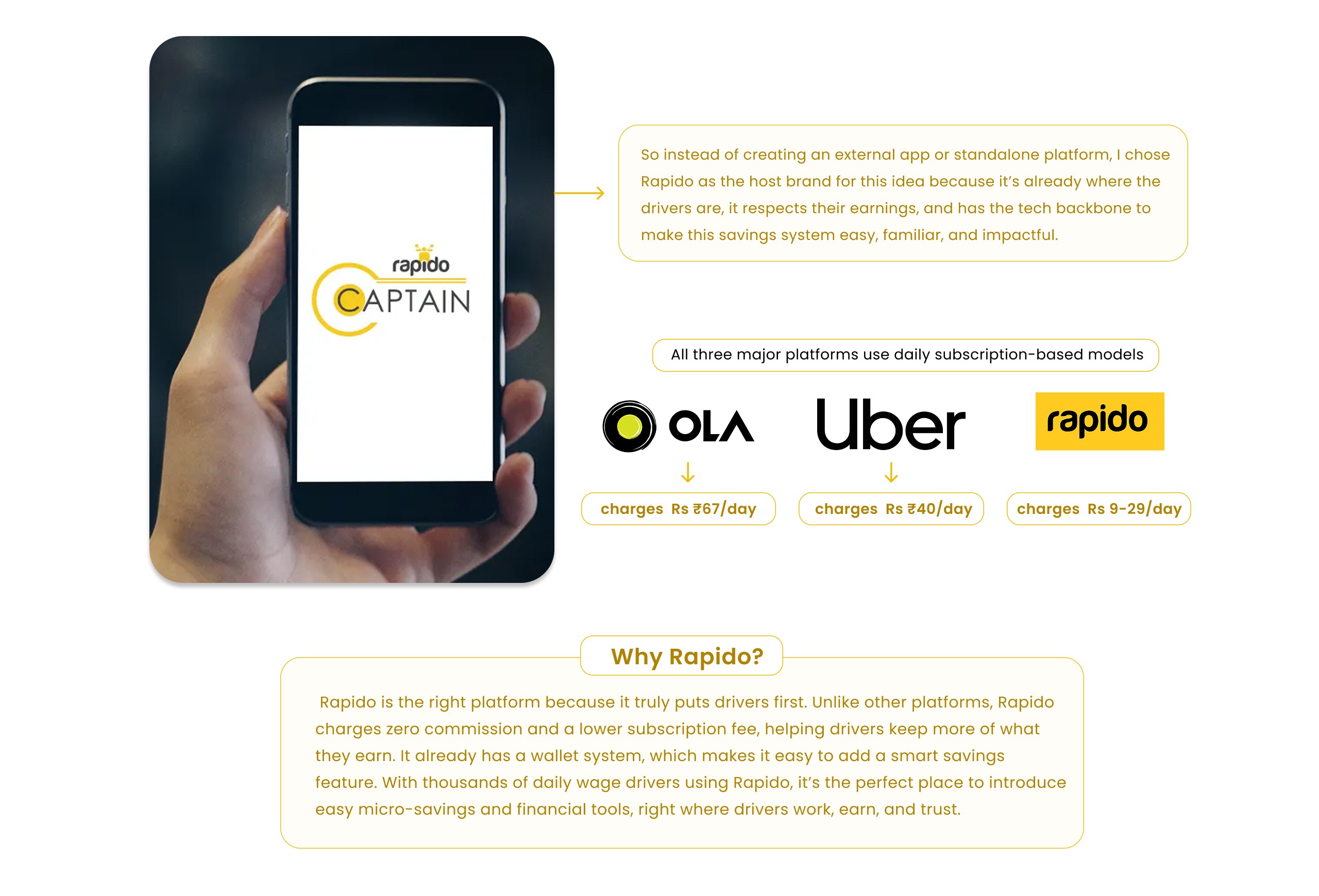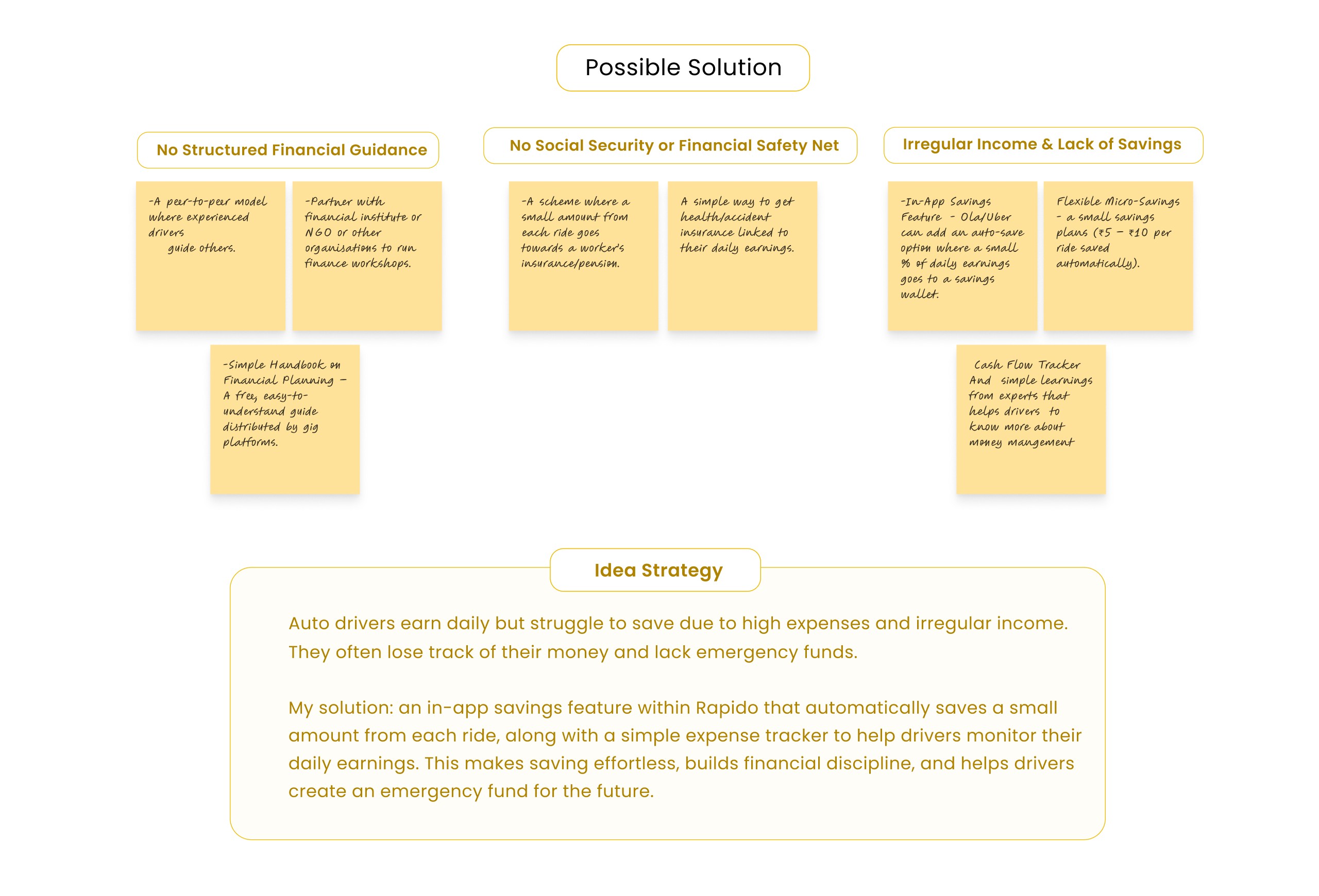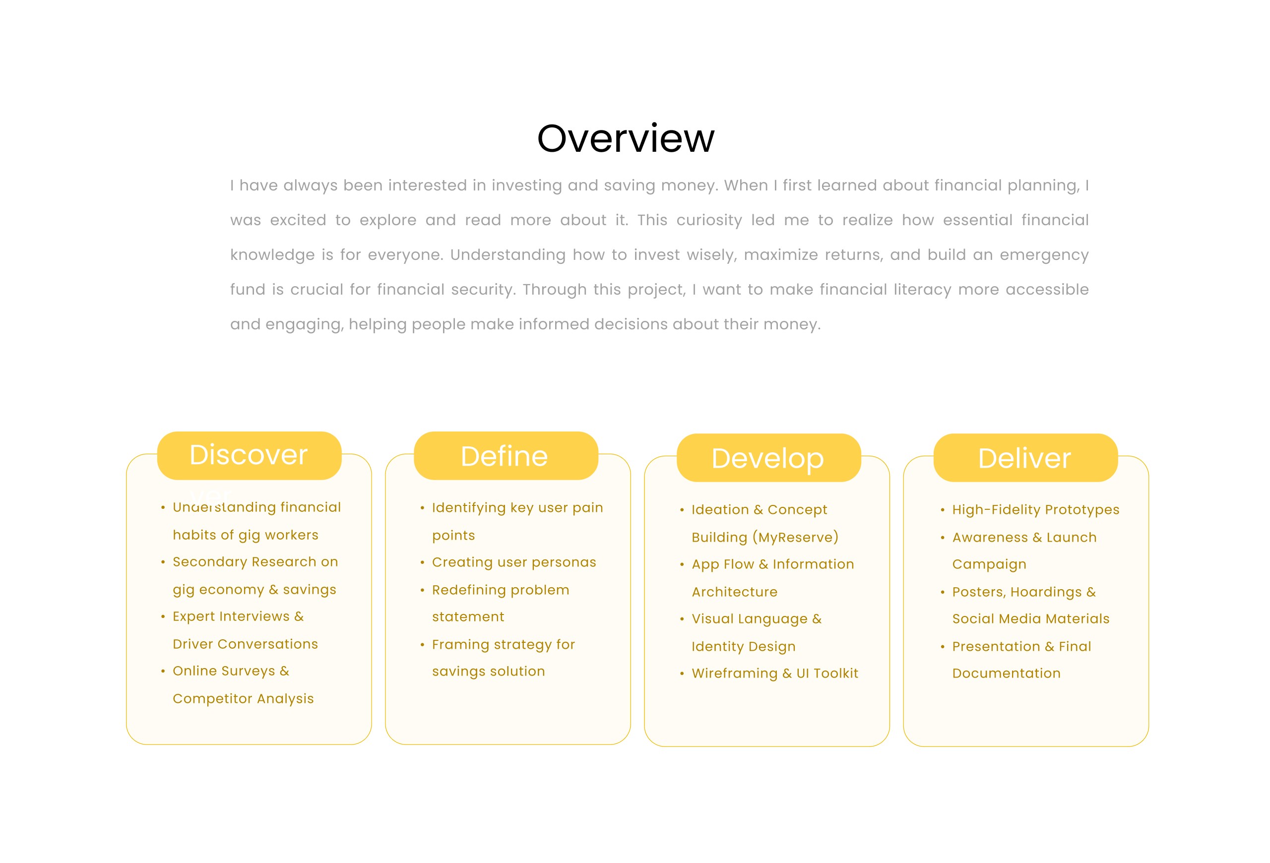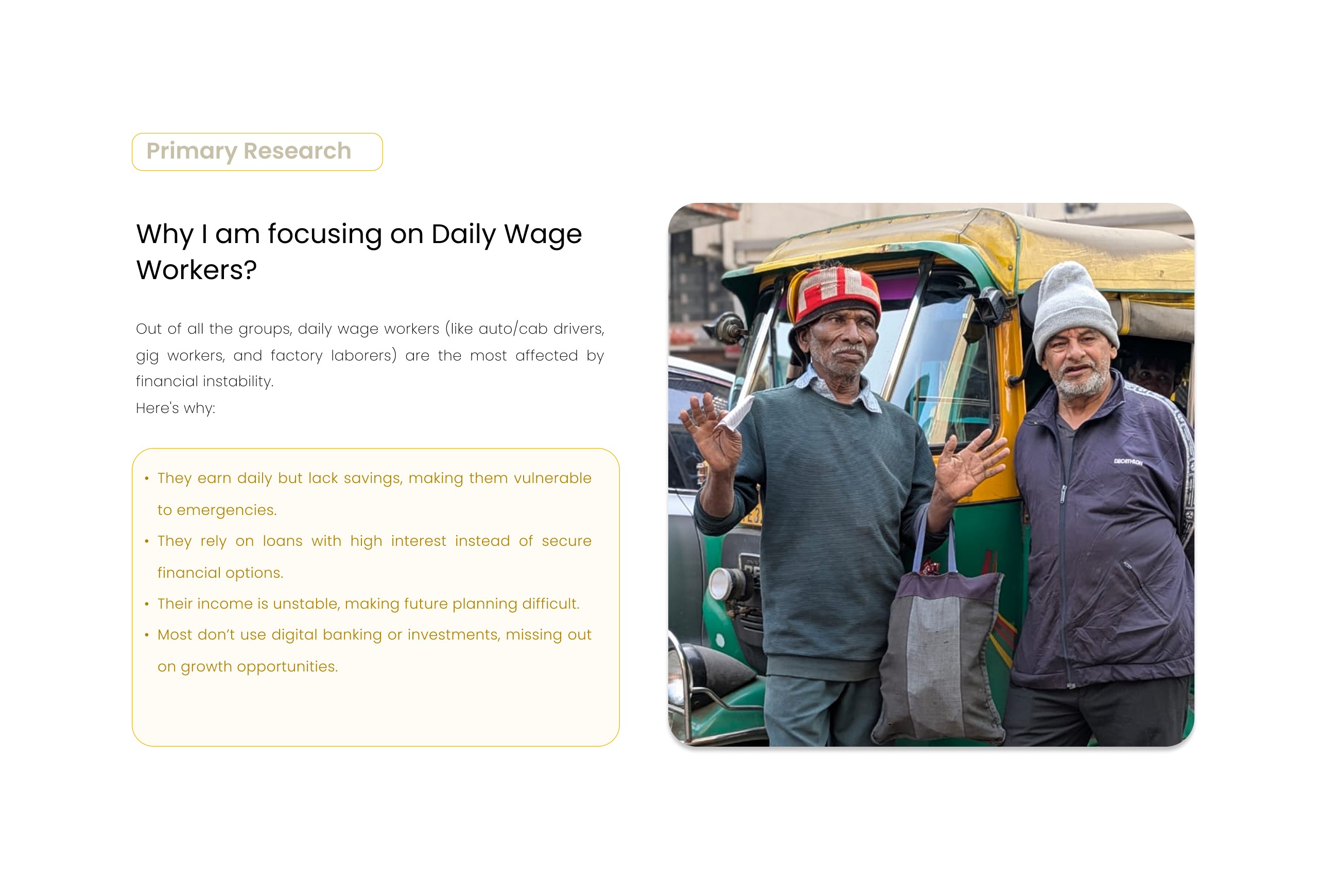 Promoting Financial Awareness and Savings Habits Among Gig Workers is a research-driven design project aimed at improving the financial wellbeing of daily wage earners, especially Rapido auto drivers. The study explores their income patterns, saving challenges, and limited access to financial tools, leading to a design solution that encourages consistent saving, provides easy financial guidance, and empowers drivers to manage their money with confidence.