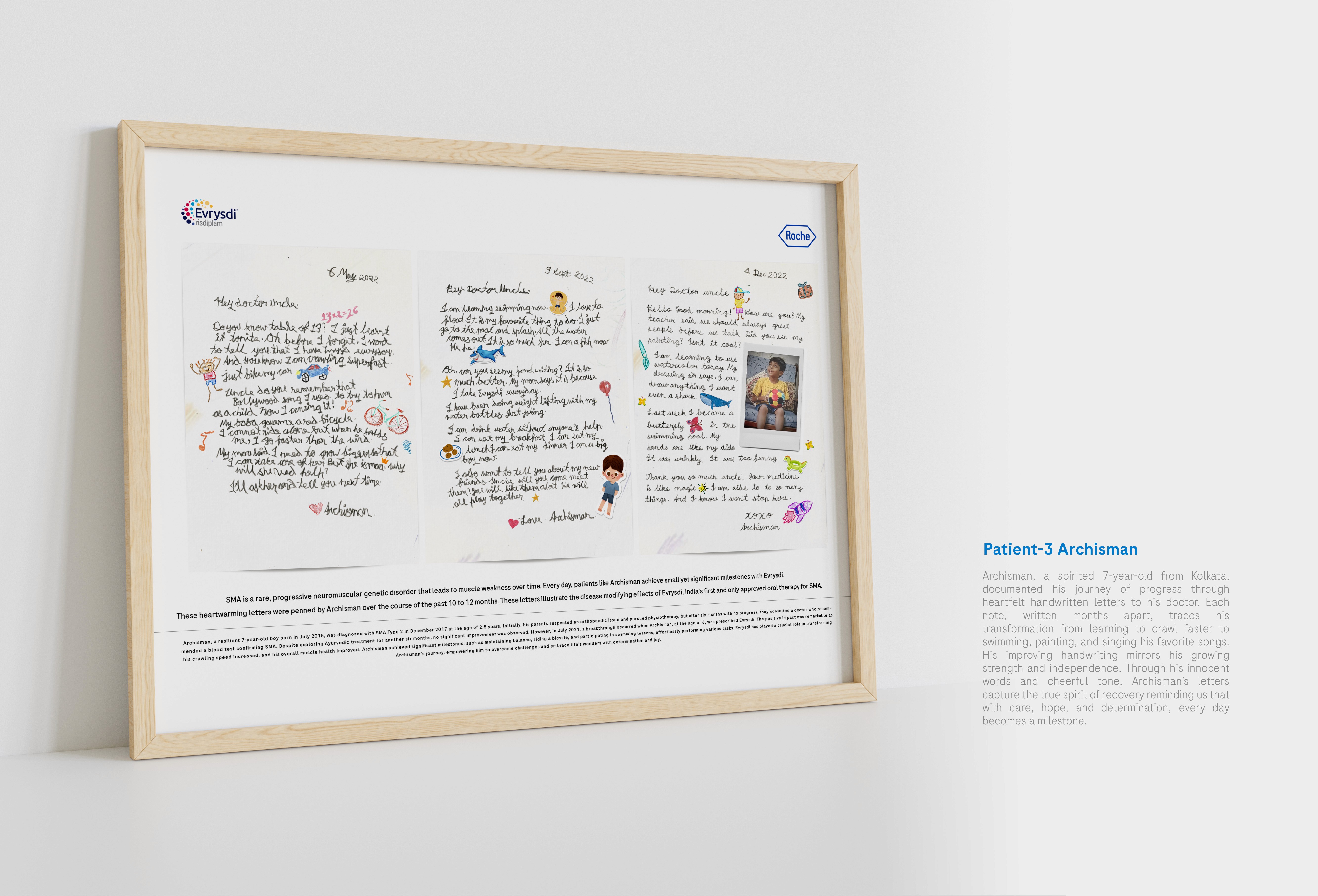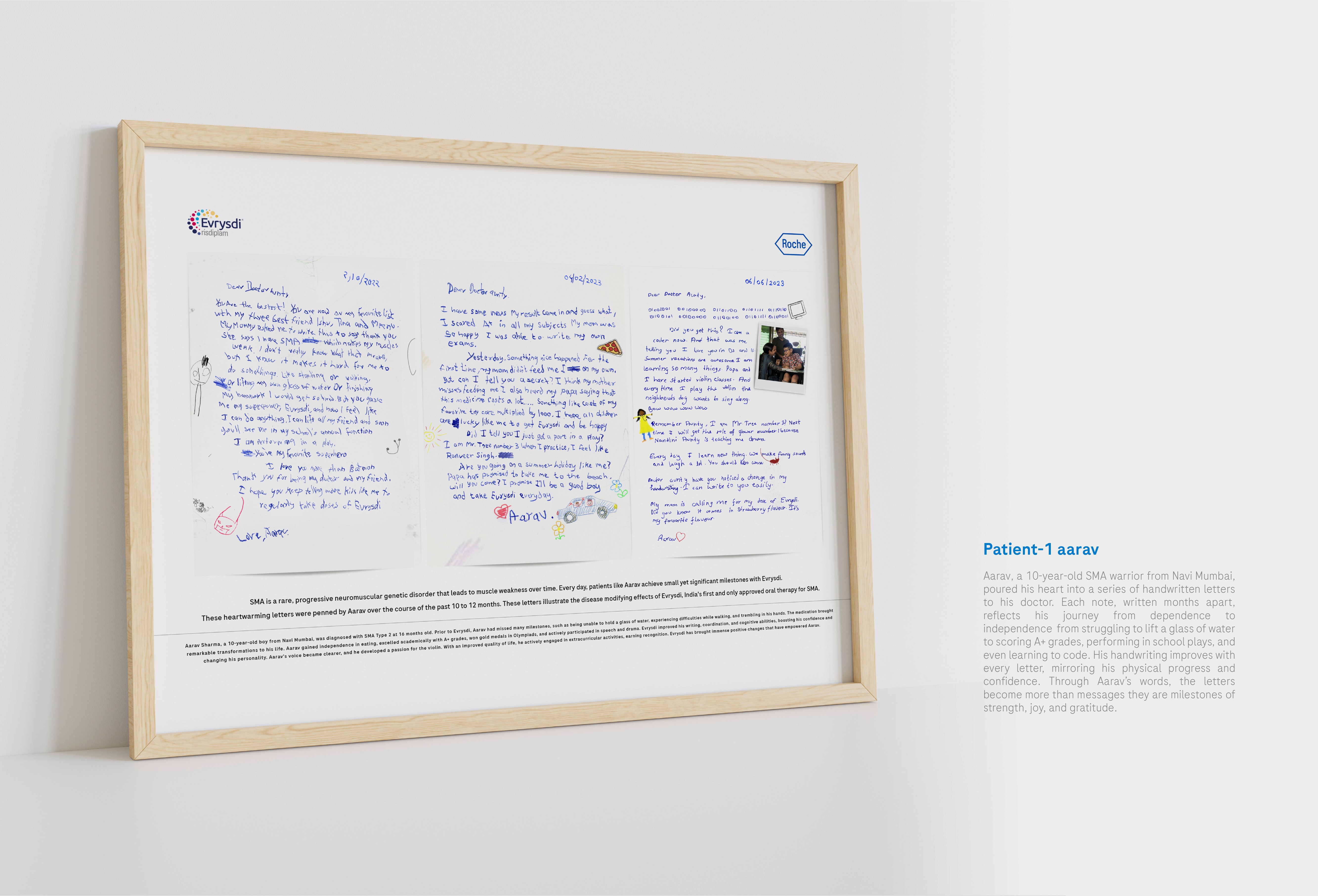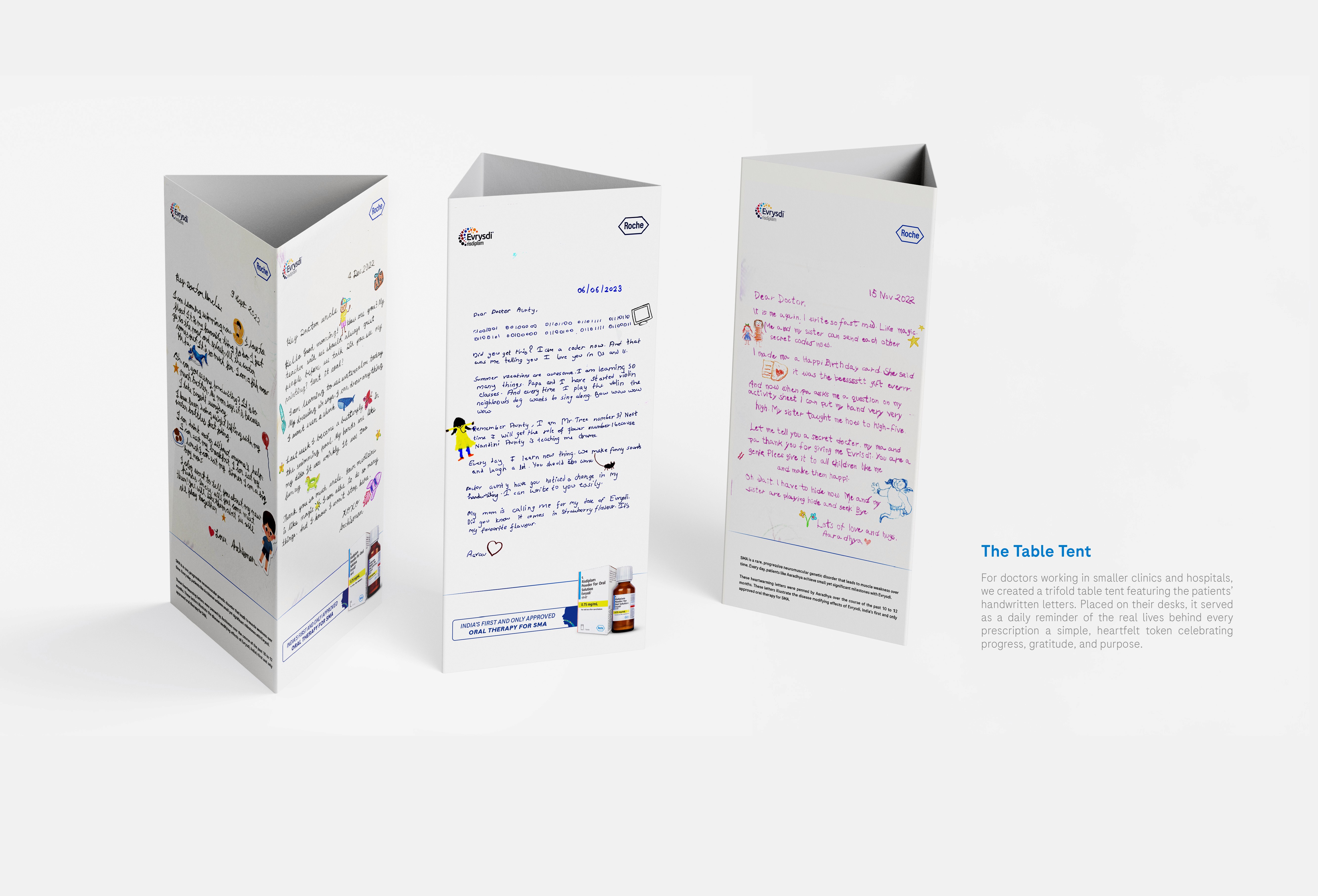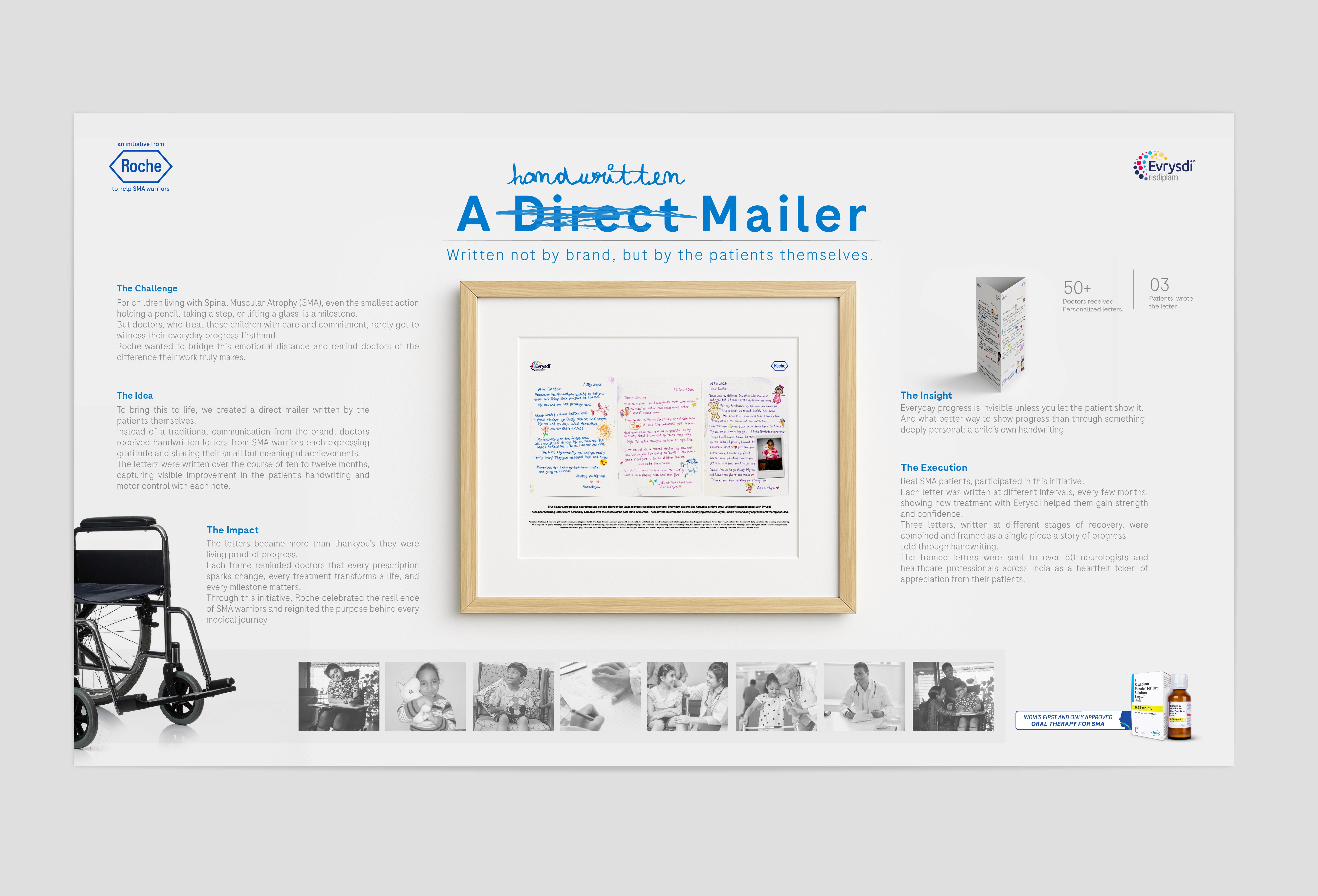 Roche, a leading healthcare brand, wanted to create a meaningful direct mailer for doctors treating patients with Spinal Muscular Atrophy (SMA). Instead of a conventional brand message, the idea was to let the patients speak for themselves. Handwritten letters, penned by SMA warriors over several months, captured their journey of progress from struggling to hold a pencil to confidently writing full sentences. Each letter reflected the real, tangible impact of Evrysdi, Roche’s SMA therapy. When framed together and sent to over 50 doctors, these letters became more than tokens of gratitude they stood as living proof that every prescription brings hope, every effort fuels progress, and truly, everyday is a milestone.